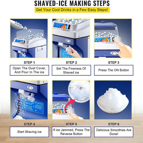 - 【EASY OPERATION TO MEET DIFFERENT DEMANDS】: The shaved ice maker machine is equipped with simple buttons for convenient operation (ON/OFF/REVERSE). The reverse buttons can prevent the device from being jammed by ice. A blade adjustment knob allows you to adjust the fineness of ice, from fine to coarse. A safety switch is hidden under the dust-proof lid (when the lid gets opened while working, the motor stops).
